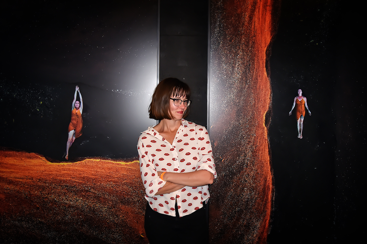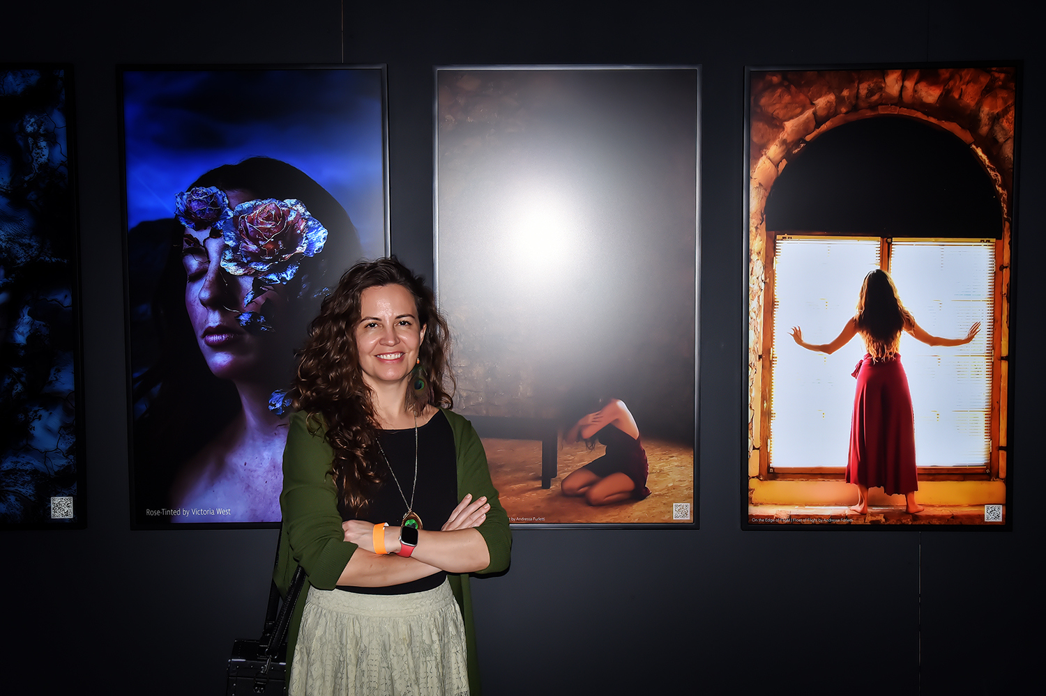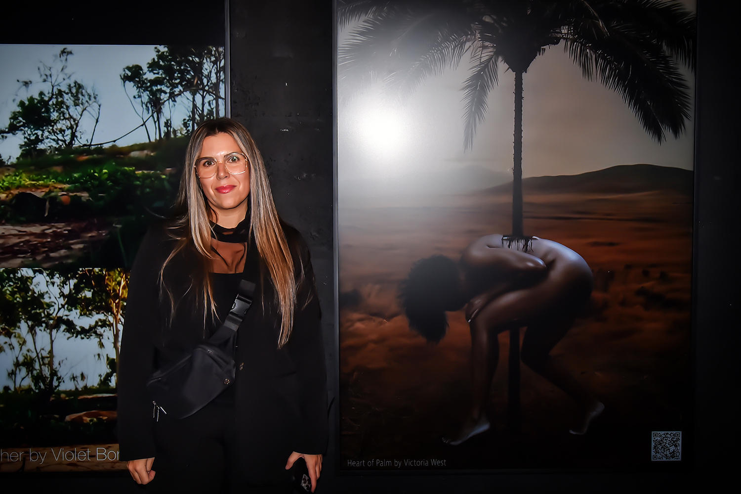 Andressa Furletti in front of works by Victoria West and Andressa Furletti
