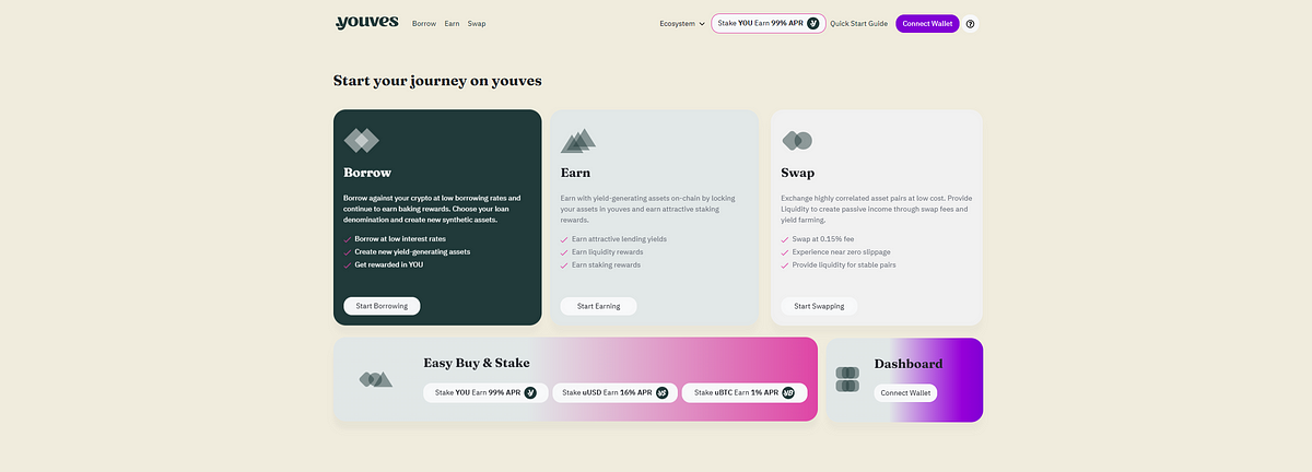 Youves is a decentralized self-governing platform that offers tools for creating synthetic assets and financial instruments. It focuses on fostering economic freedom by providing a wide array of functionalities, including yield earning through staking and minting synthetic tokens backed by stablecoin reserves.