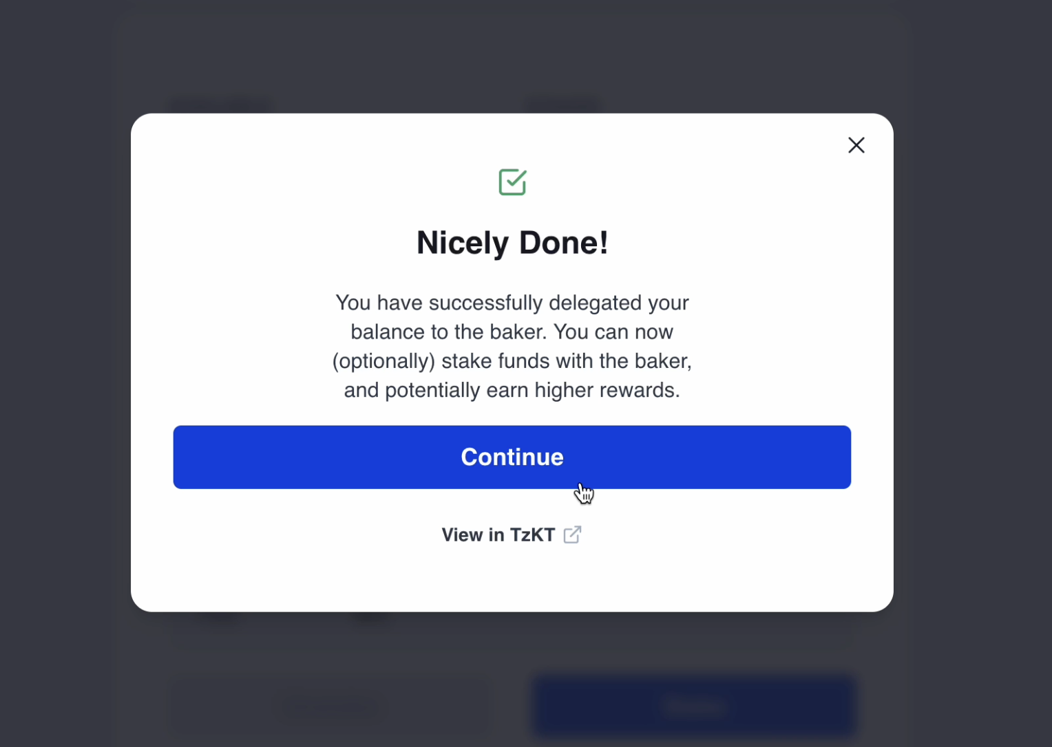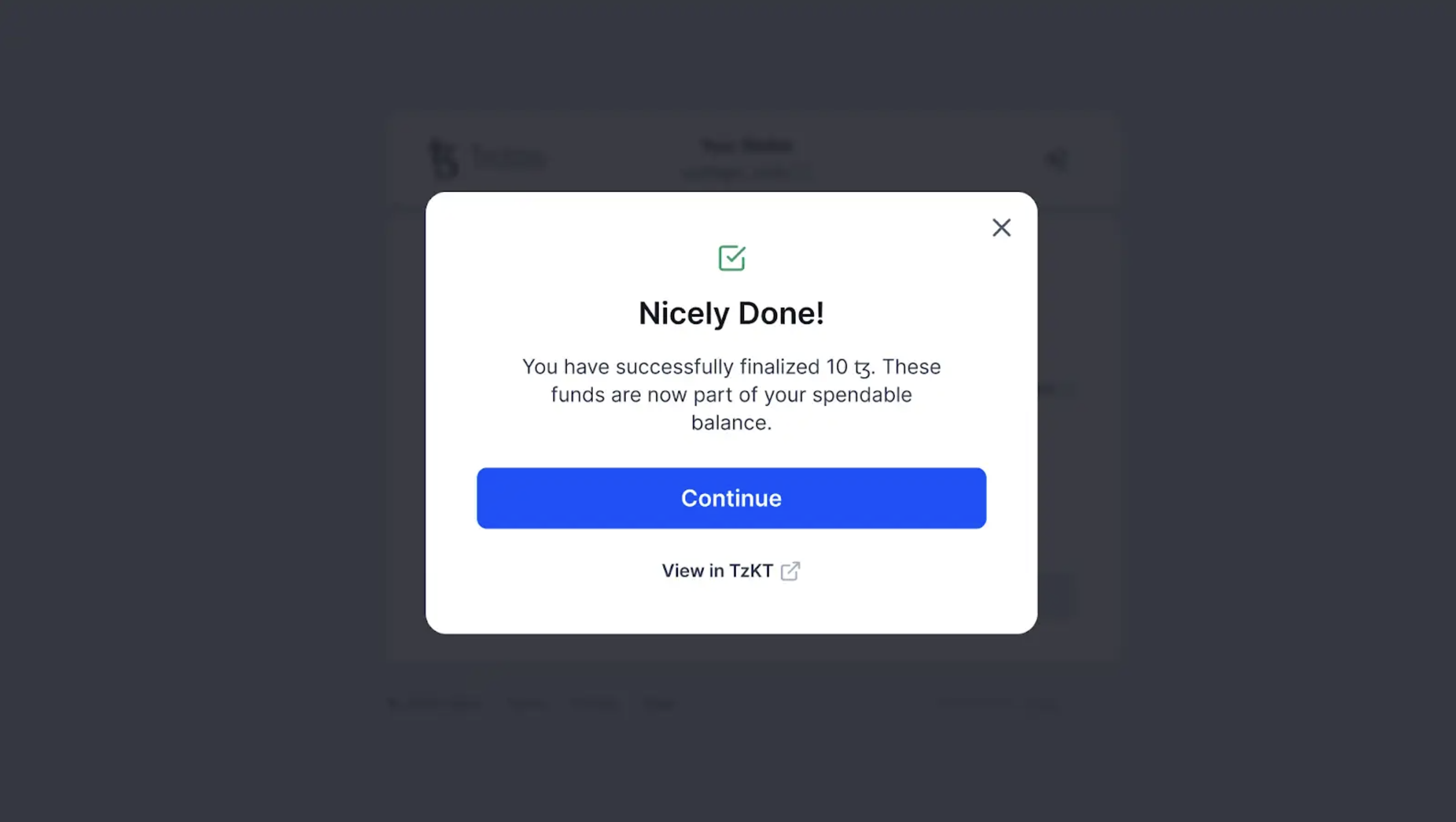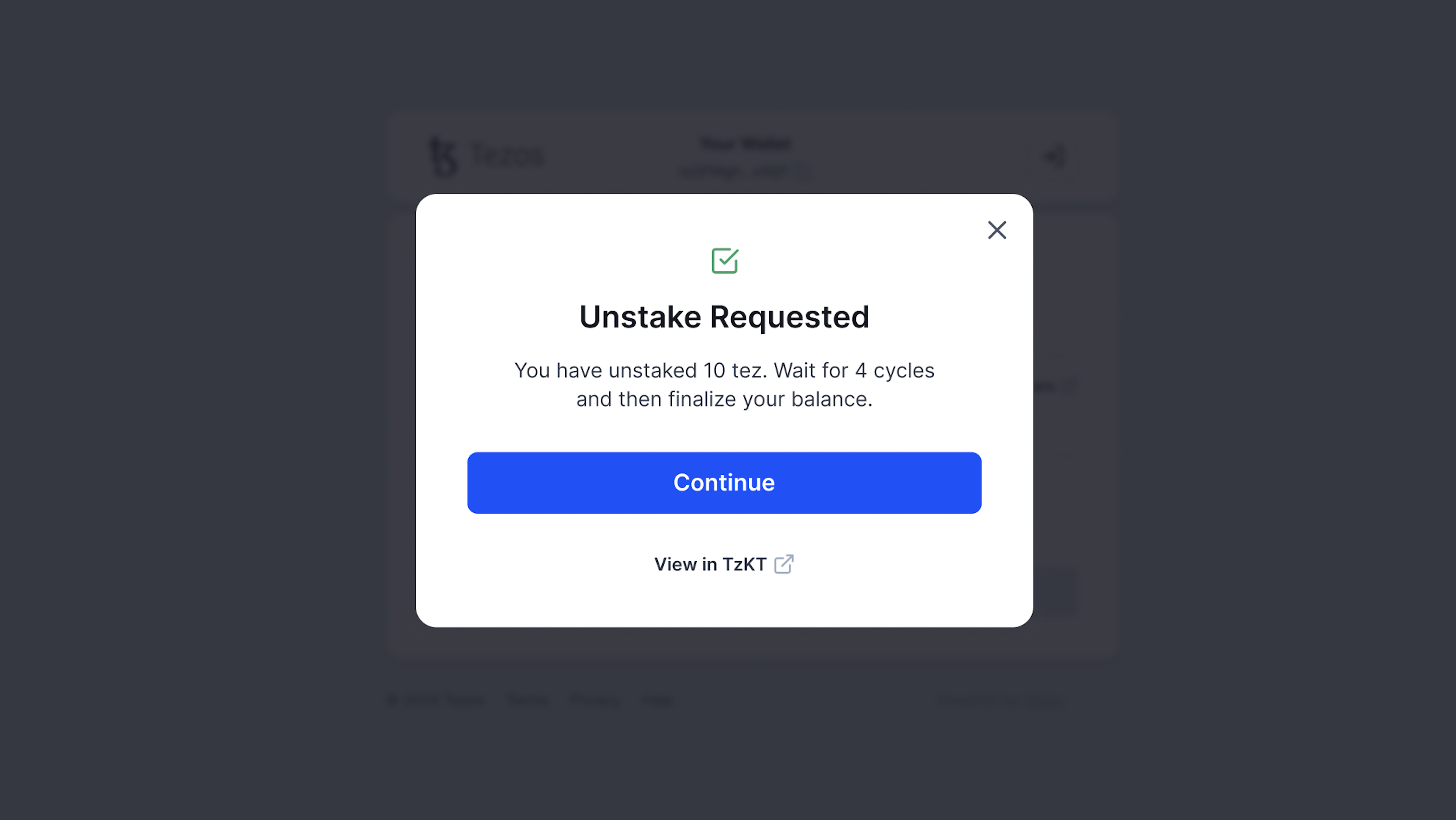 Nicely done! You have now completed the unstaking process. Click Continue to go back to the dashboard view and see your updated tez balance.