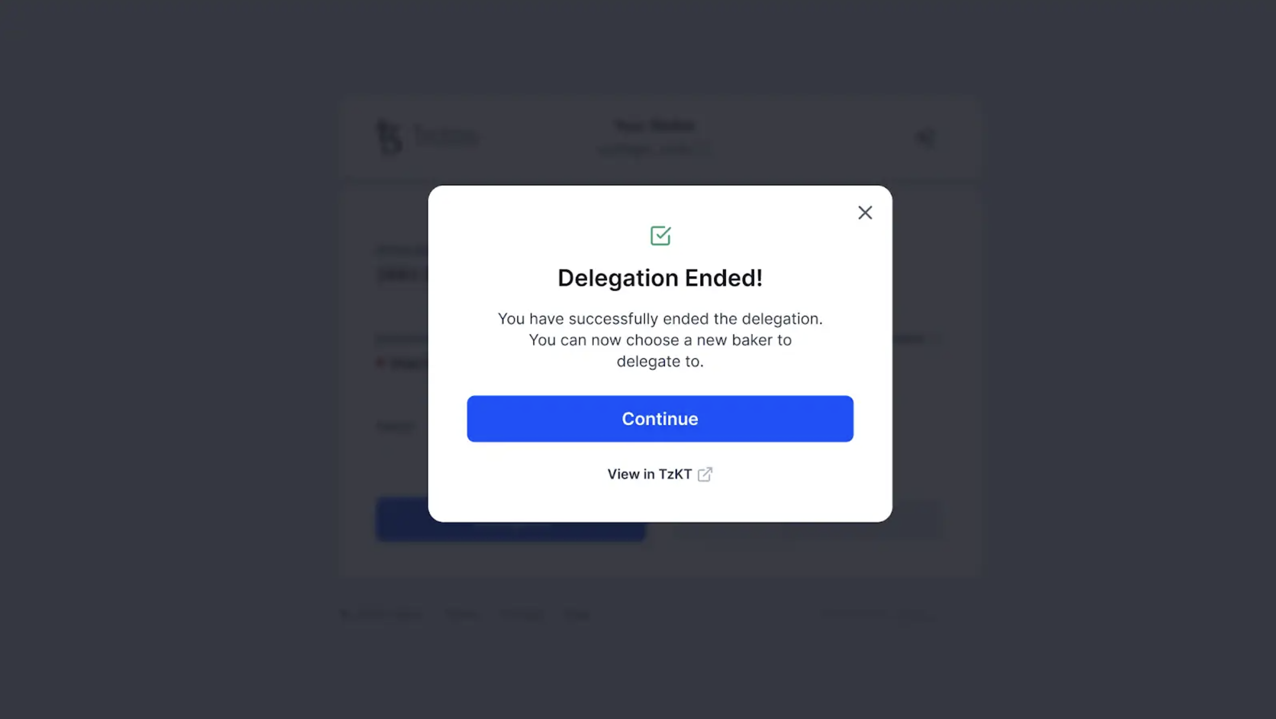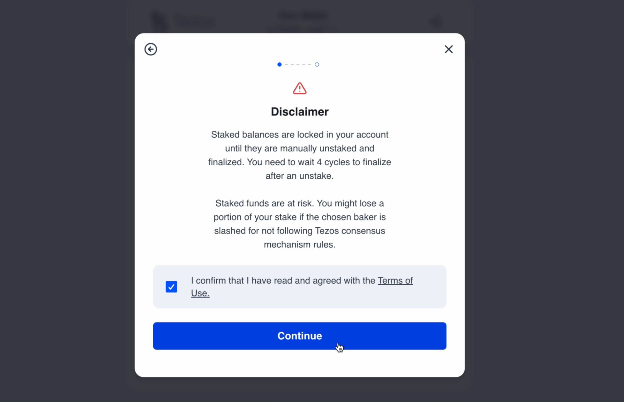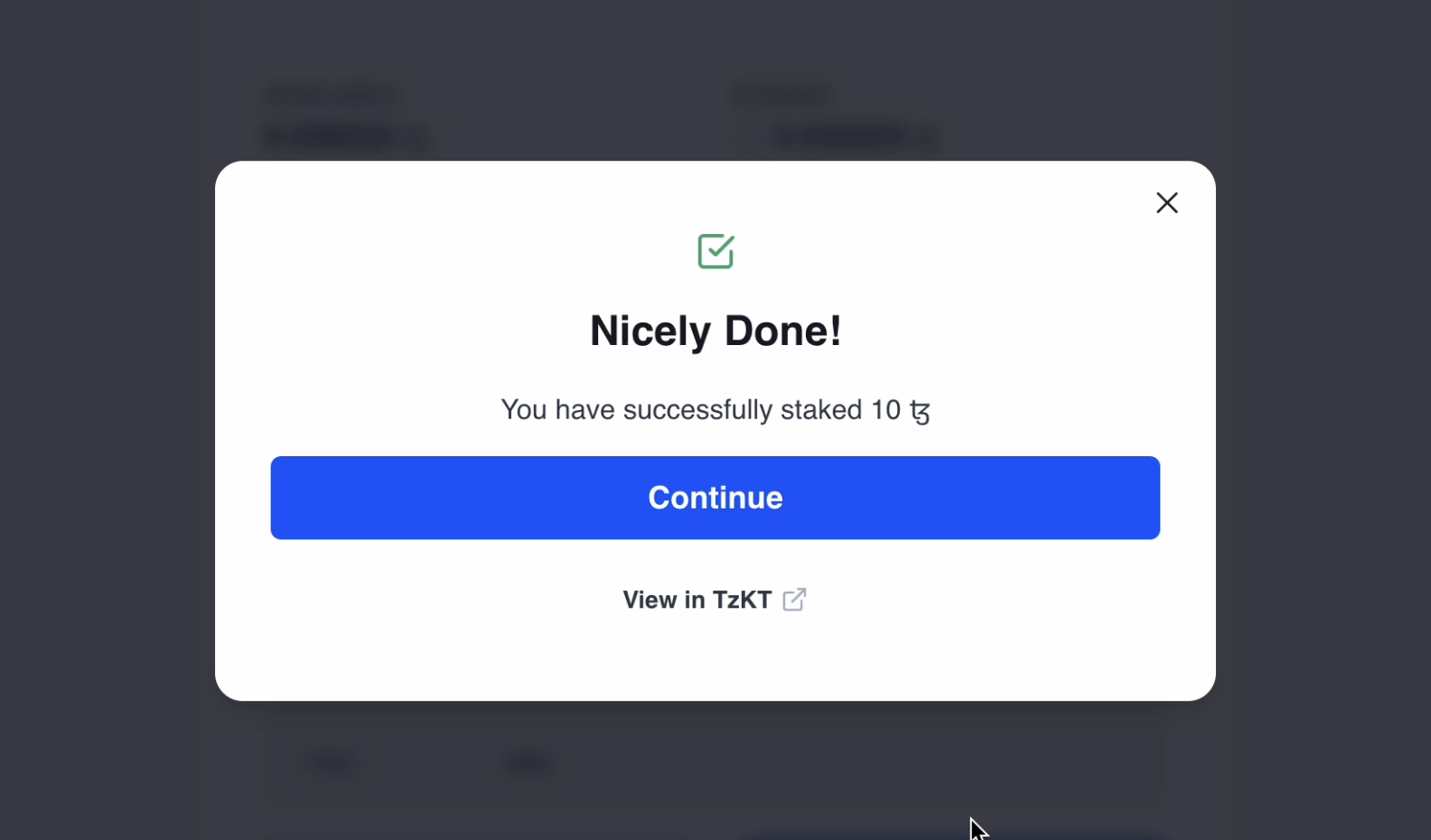 Nicely done! You have now completed the unstaking process. Click Continue to go back to the dashboard view and see your updated tez balance.