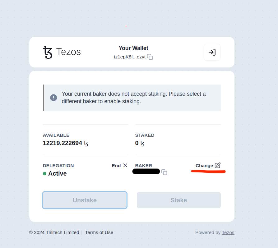 If you’re already delegating to a baker and your baker doesn’t accept external staking, you’ll see a note asking you to select a different baker in order to stake.