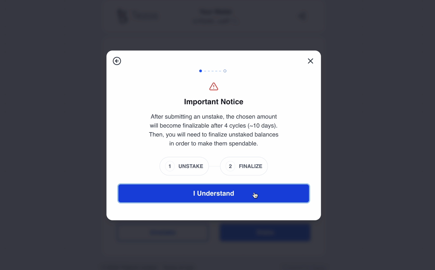 You should now see your unstake request on the dashboard, under Pending Unstake Requests. Come back after 4 cycles (or around 10 days) to finalize your unstaking and start using your funds again.