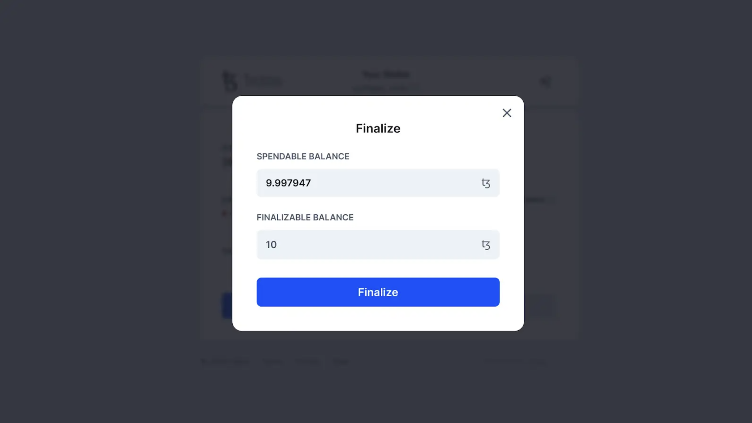 In the confirmation screen that pops up, you should see the amount you requested to unstake under Finalizable Balance. Click Finalize.