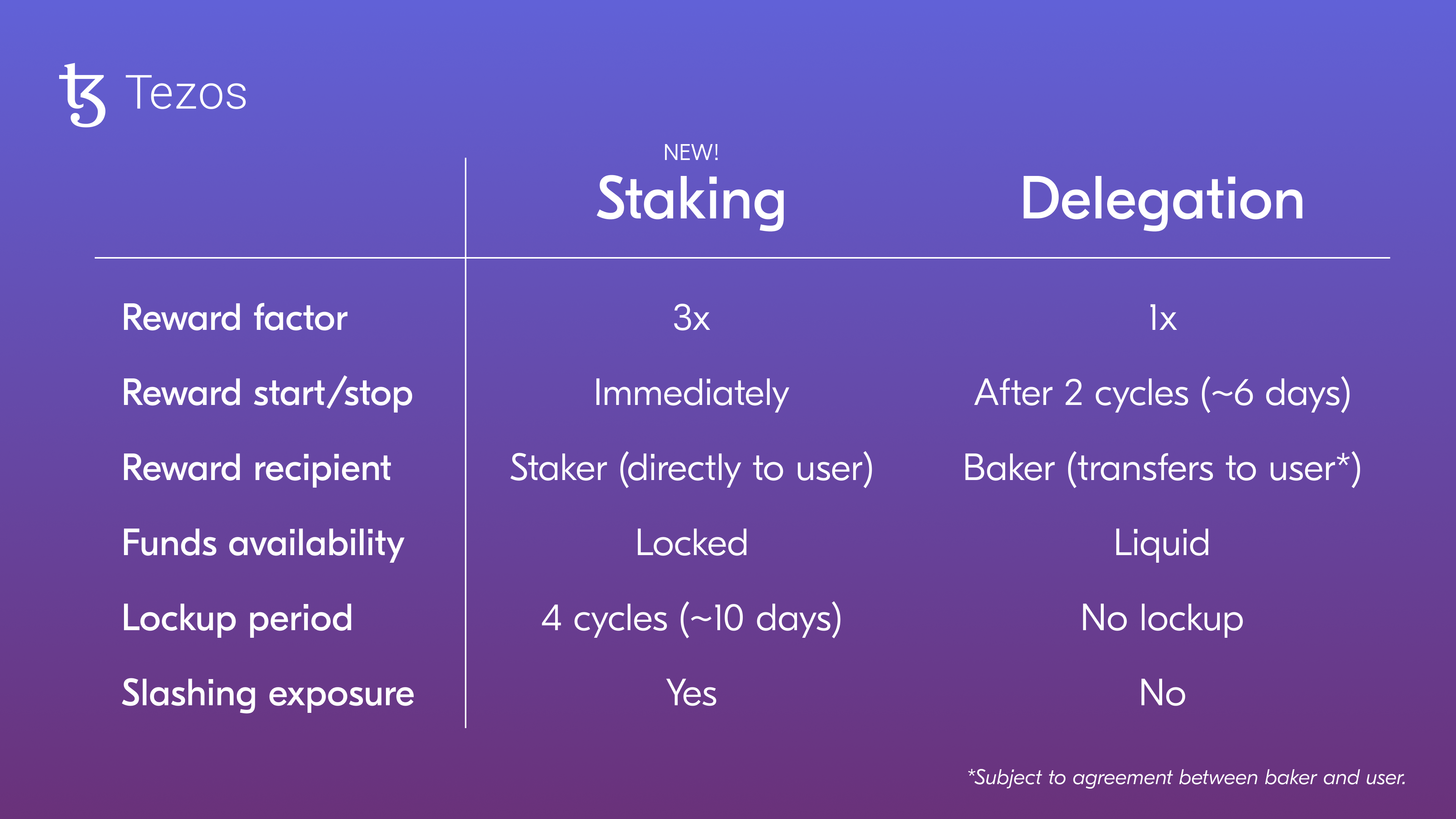 From a user perspective, the main differences between staking and delegating fall within the following categories: