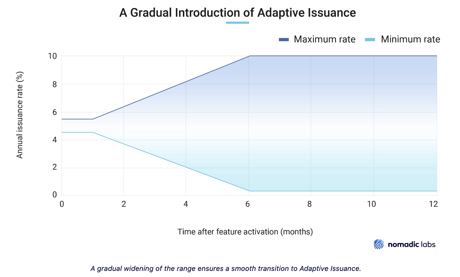 The Adaptive Issuance rate will initially stay between 4.5% and 5.5%. The span gradually increases over the next 6 months, eventually allowing the rate to fluctuate between 0.25% and 10%.