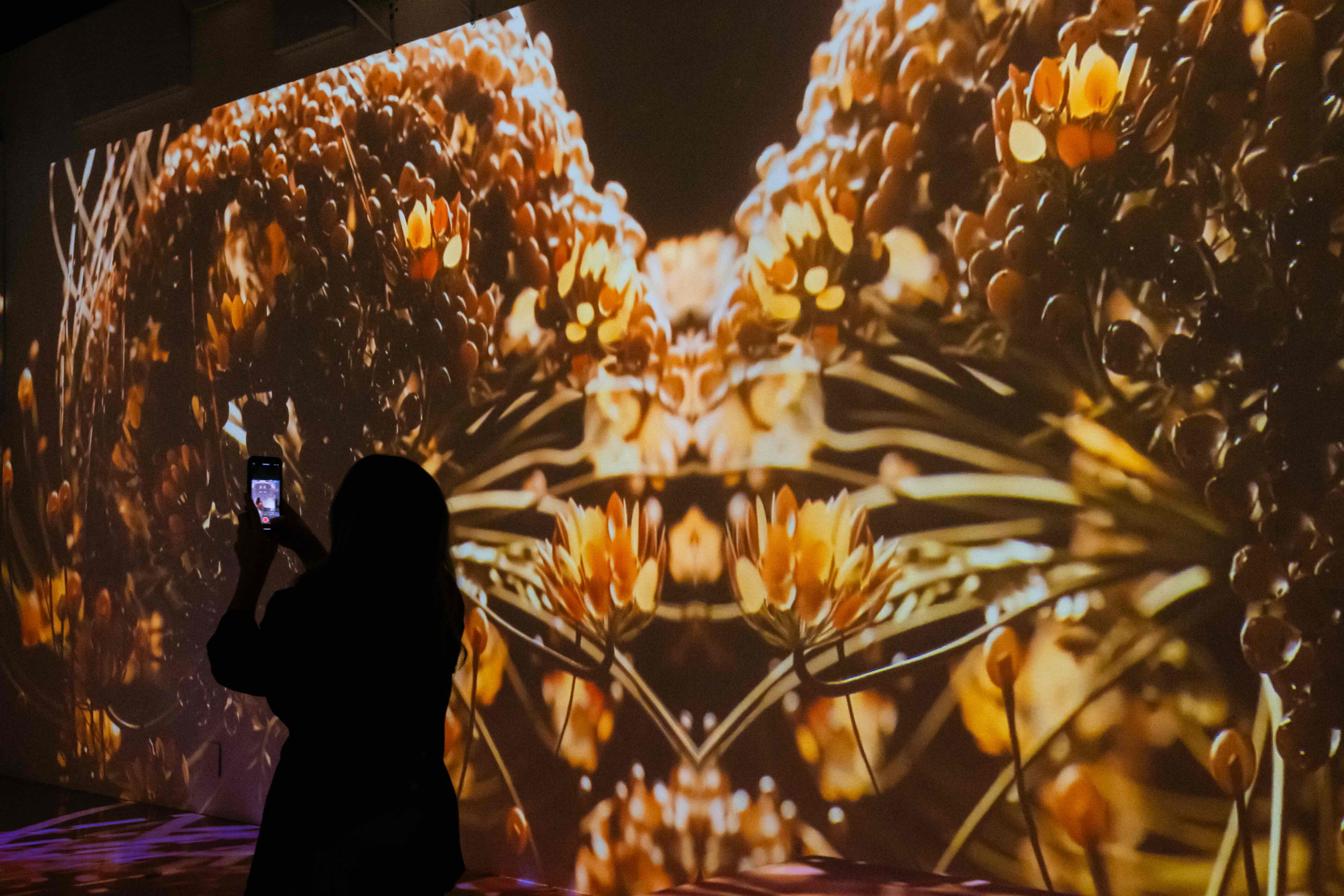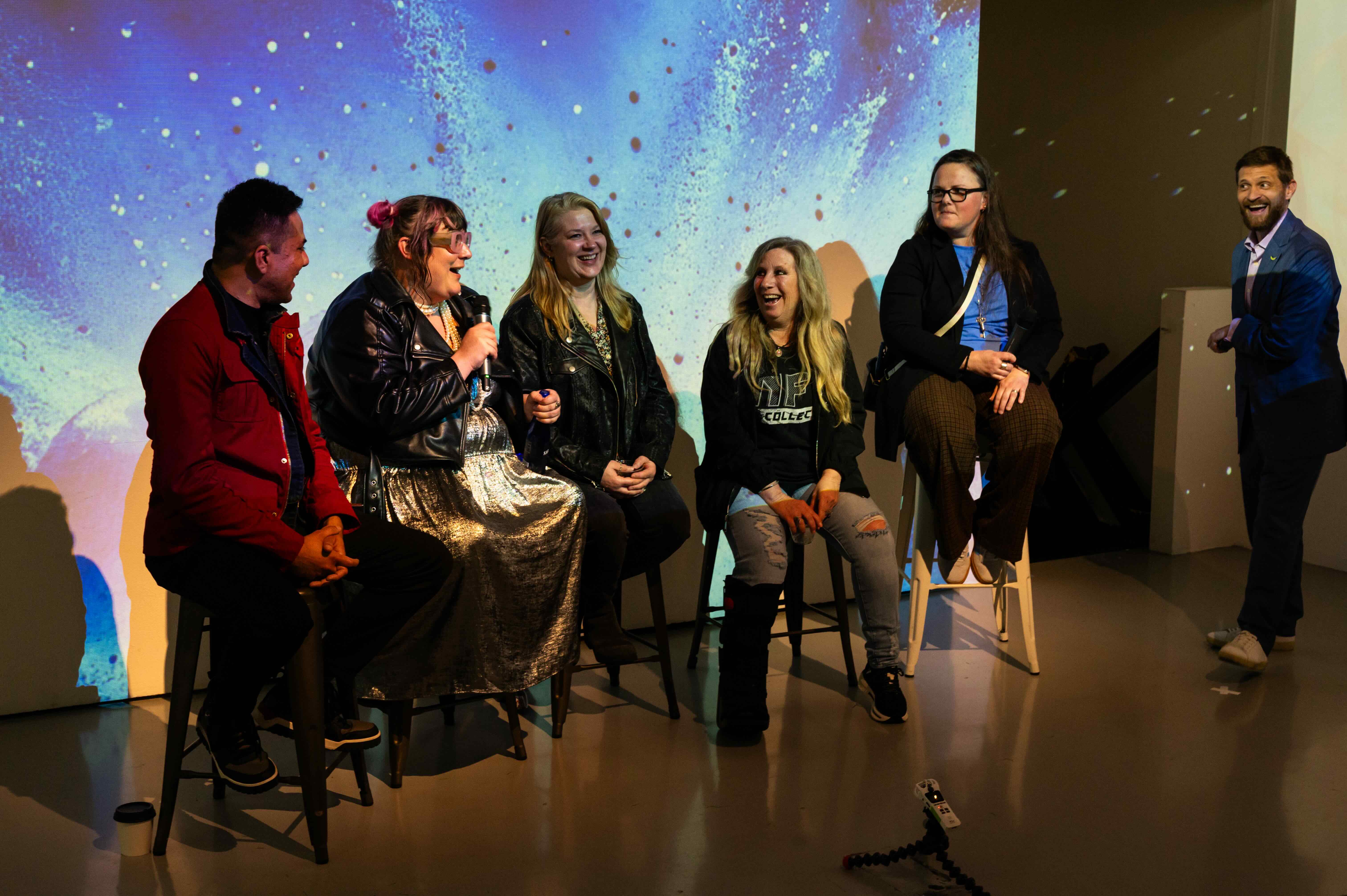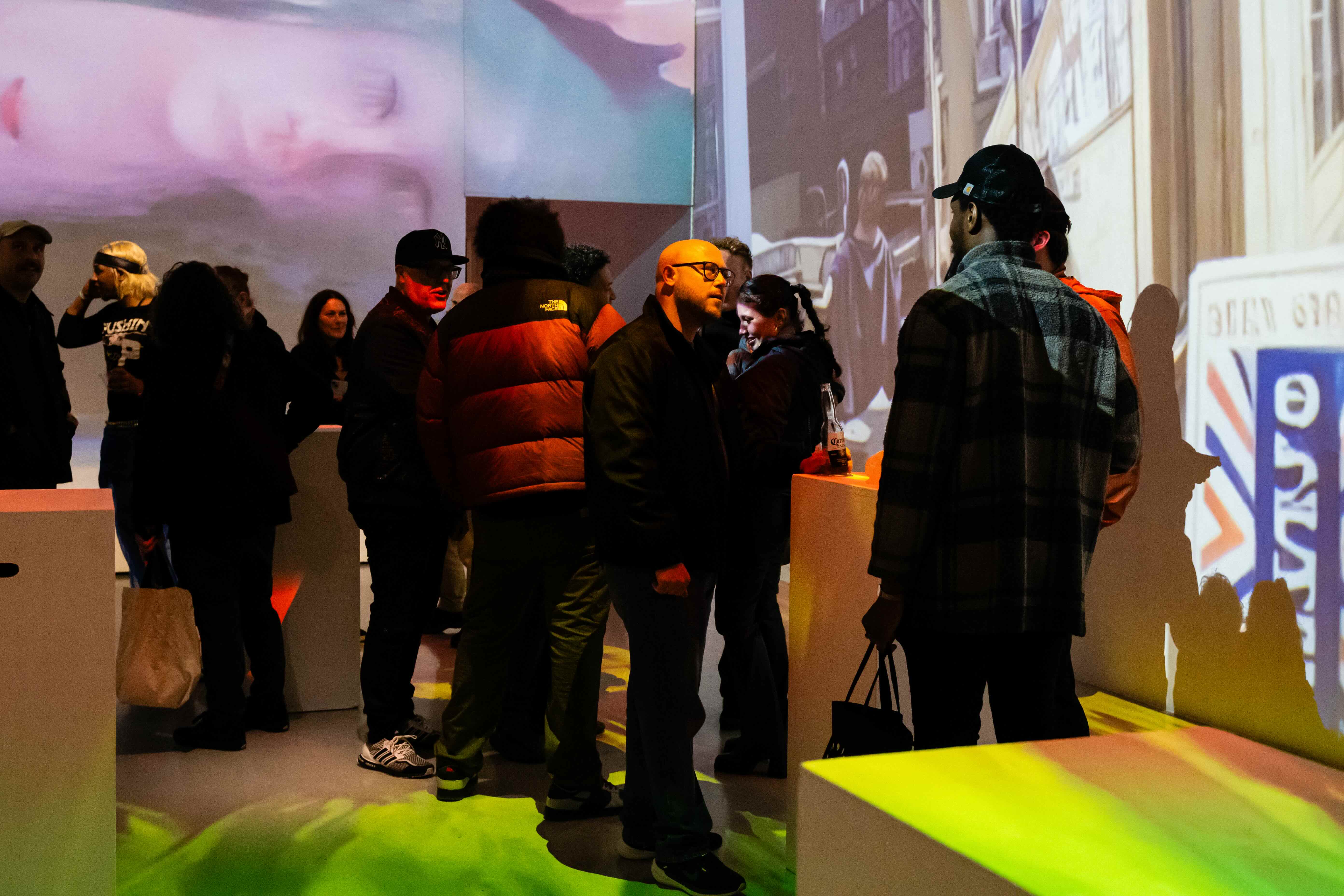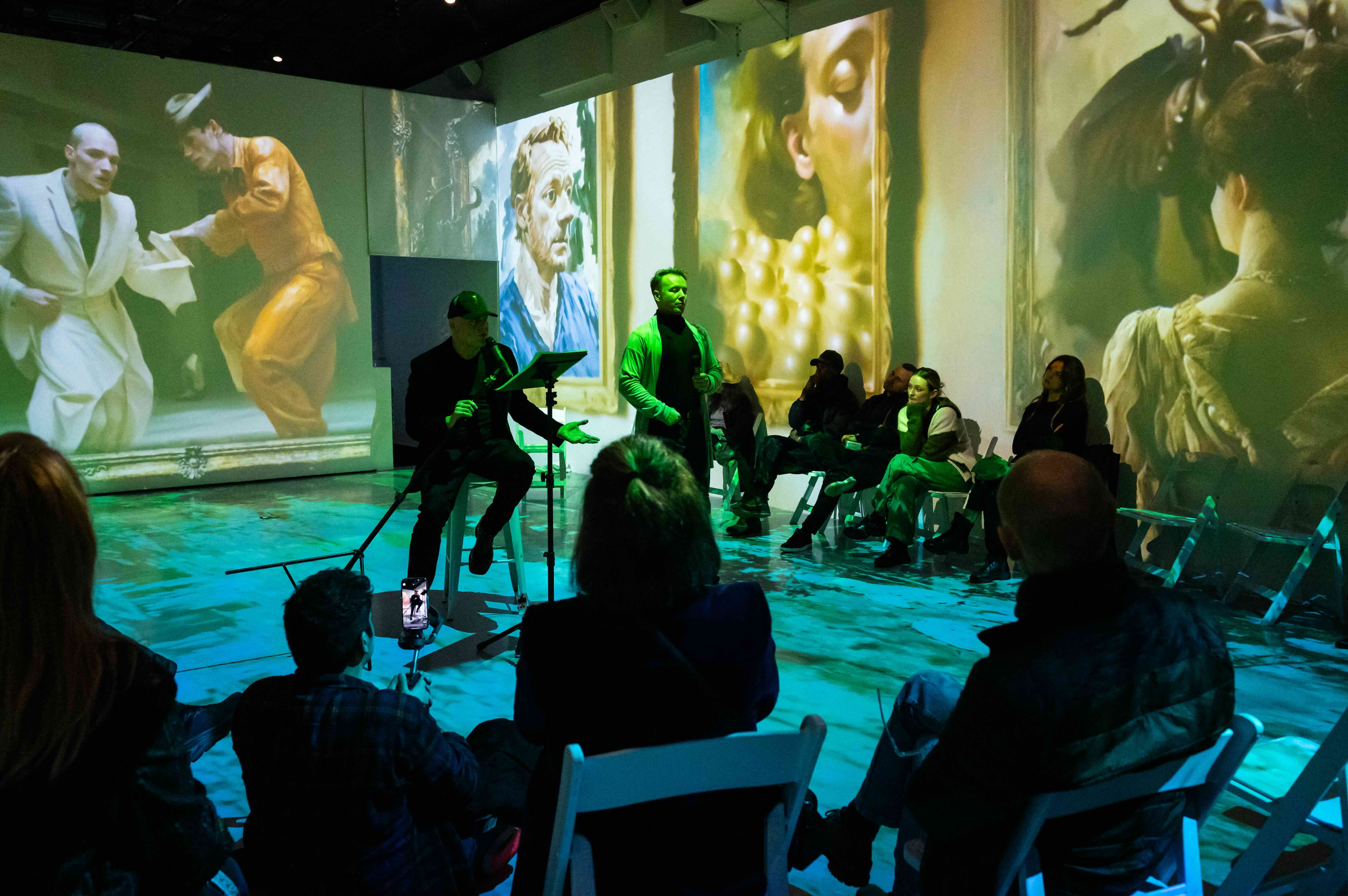 LUME Studios buzzed with energy as the audience gathered. Artists engaged in lively conversations with attendees while their artwork was displayed through projections and large screens.