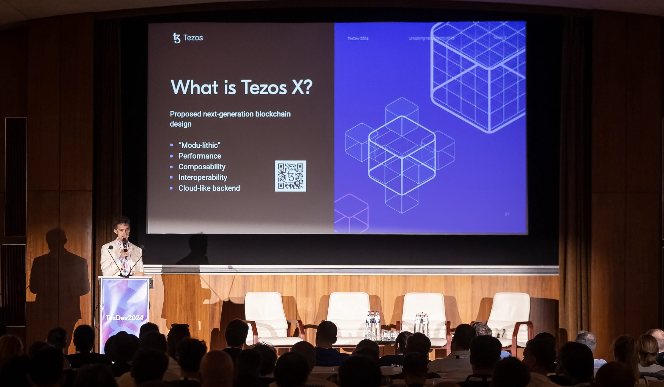 On the main stage of the flagship event, Tezos co-founder Arthur Breitman opened the day by presenting a proposed roadmap to Tezos X to hundreds of community members.