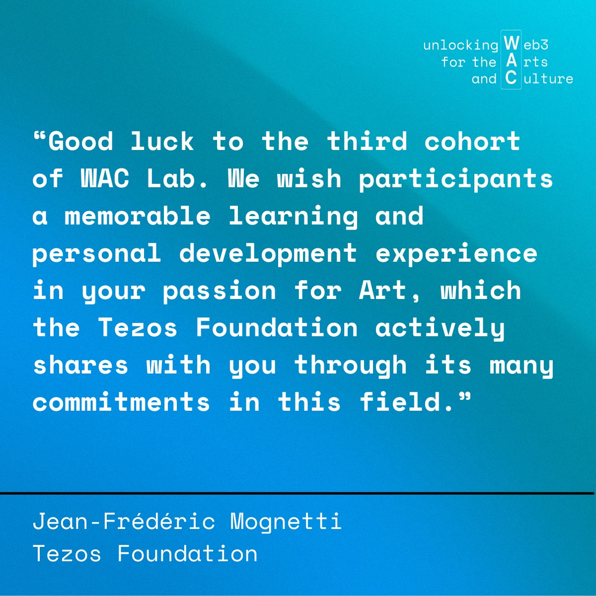 WAC Lab is proud to continue for the third year in a row its mission of fostering innovation, education, and collaboration within the arts and culture sector, with the invaluable support of the Tezos Foundation and all the museum and web3 experts who are part of the WAC LAB ecosystem.